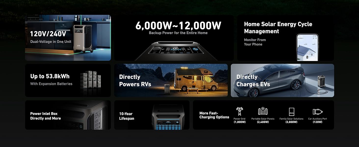 • Expand to 53.8kWh Capacity: With two Anker SOLIX F3800 Portable Power Stations and 12 expansion batteries (Anker SOLIX BP3800), you have access to 53.8kWh capacity.